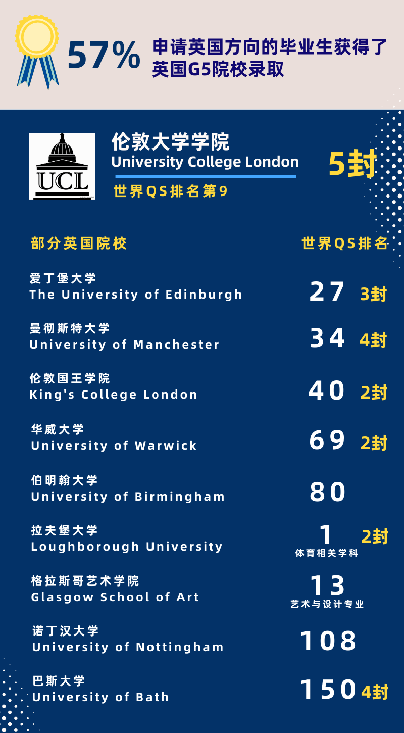 英国录取中,杭州威雅毕业生收到5封UCL伦敦大学学院录取,G5超级精英大学院校申请者全部录取,录取率100%!
