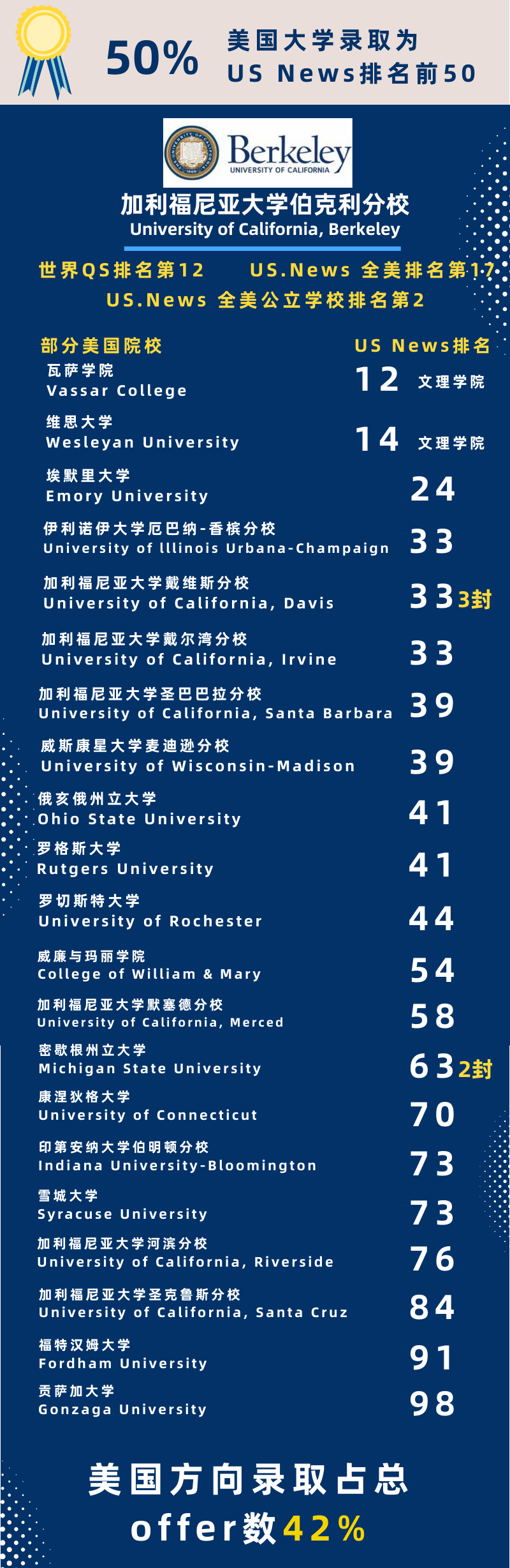 美国方向录取创历史新高,占比超40%,超半数录取为US NEWS全美排名前50高校,录取质量与数量均突破历史!